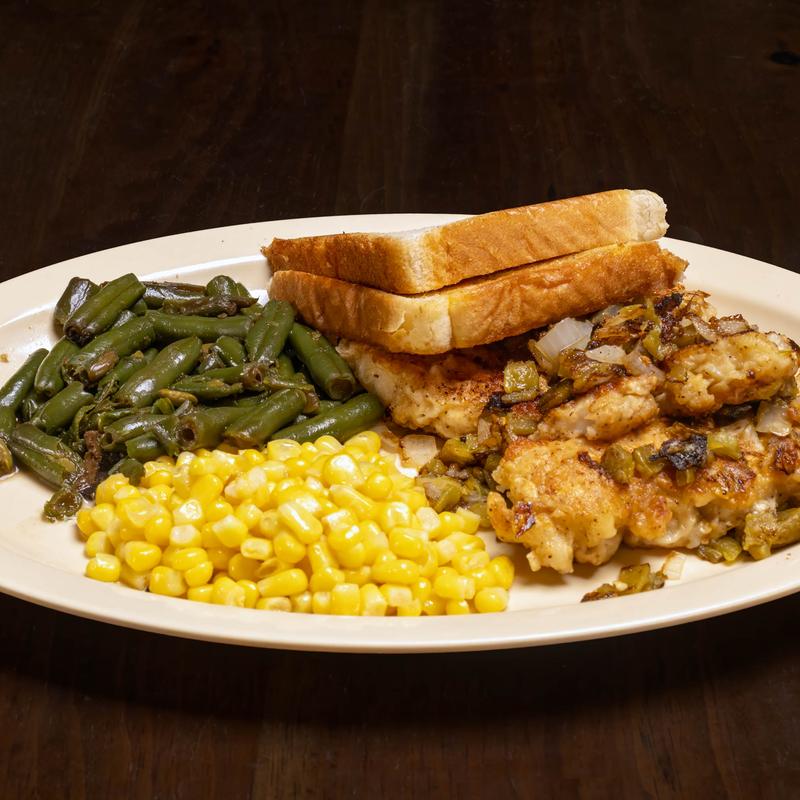 Hand-breaded chicken strips smothered with sauteed onions, green chilis.